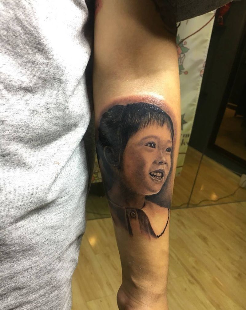 当前位置: 首页 >安徽省芜湖市纹身店-轩辕之道刺青纹身图案>小女孩纹身图片_手部手臂欧美写实小孩肖像写实纹身图案