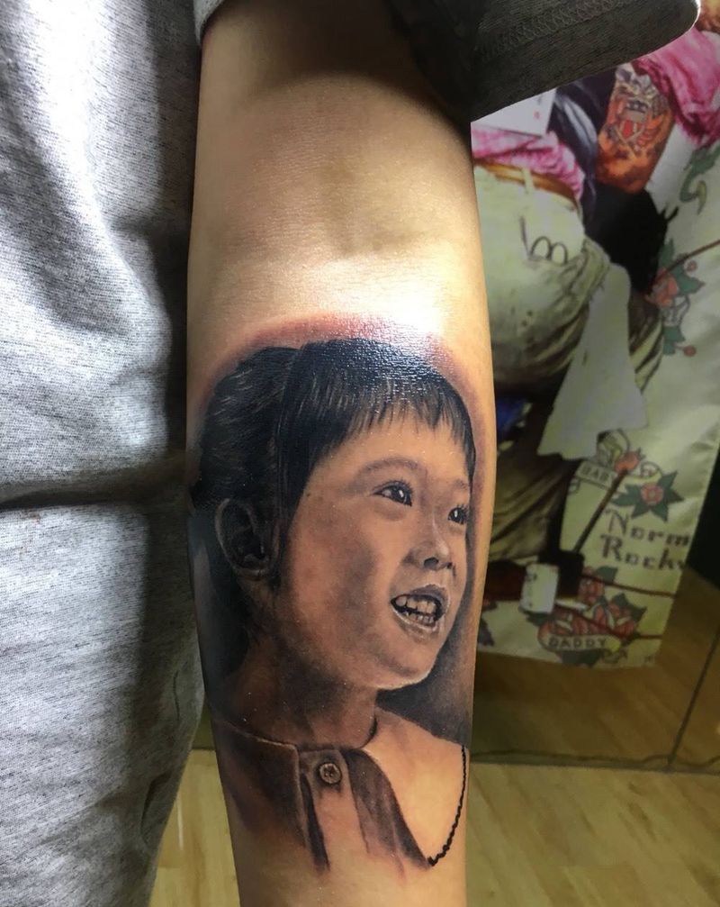当前位置: 首页 >安徽省芜湖市纹身店-轩辕之道刺青纹身图案>小女孩纹身图片_手部手臂欧美写实小孩肖像写实纹身图案