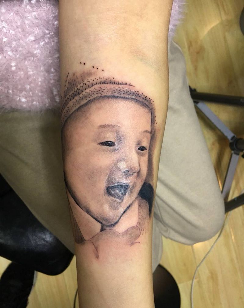 当前位置: 首页 >安徽省芜湖市纹身店-轩辕之道刺青纹身图案>人物纹身图片_手臂手部欧美写实宝宝人物小孩纹身图案