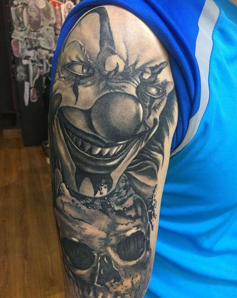 当前位置: 首页 >安徽省芜湖市纹身店-轩辕之道刺青纹身图案>小丑纹身图片_手臂手部欧美写实纹身图案