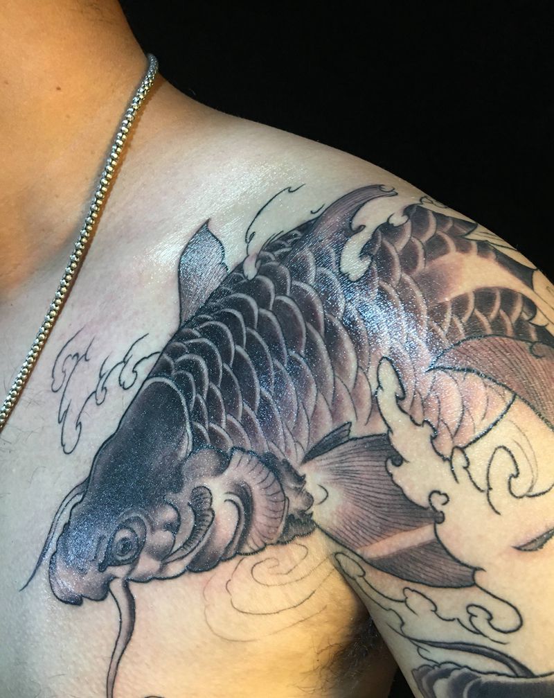 当前位置: 首页 >安徽省芜湖市纹身店-轩辕之道刺青纹身图案>年年有余纹身图片_手臂胸部新传统鱼半甲新传统纹身图案