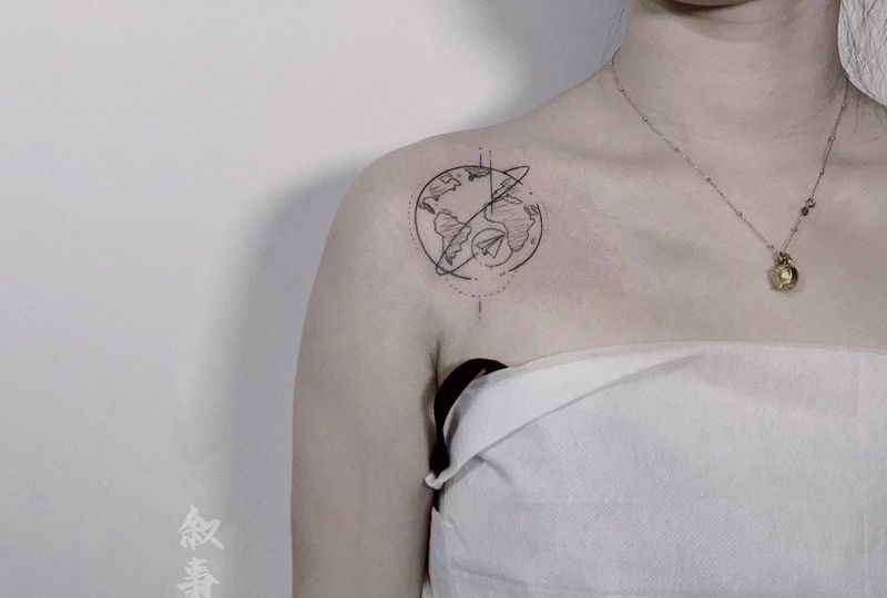 情侣纹身纹身图片_胸部地球 旅行纹身图案