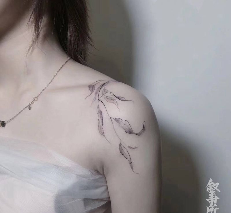 女孩的肩纹身图片_肩部水墨柳叶 水墨纹身图案