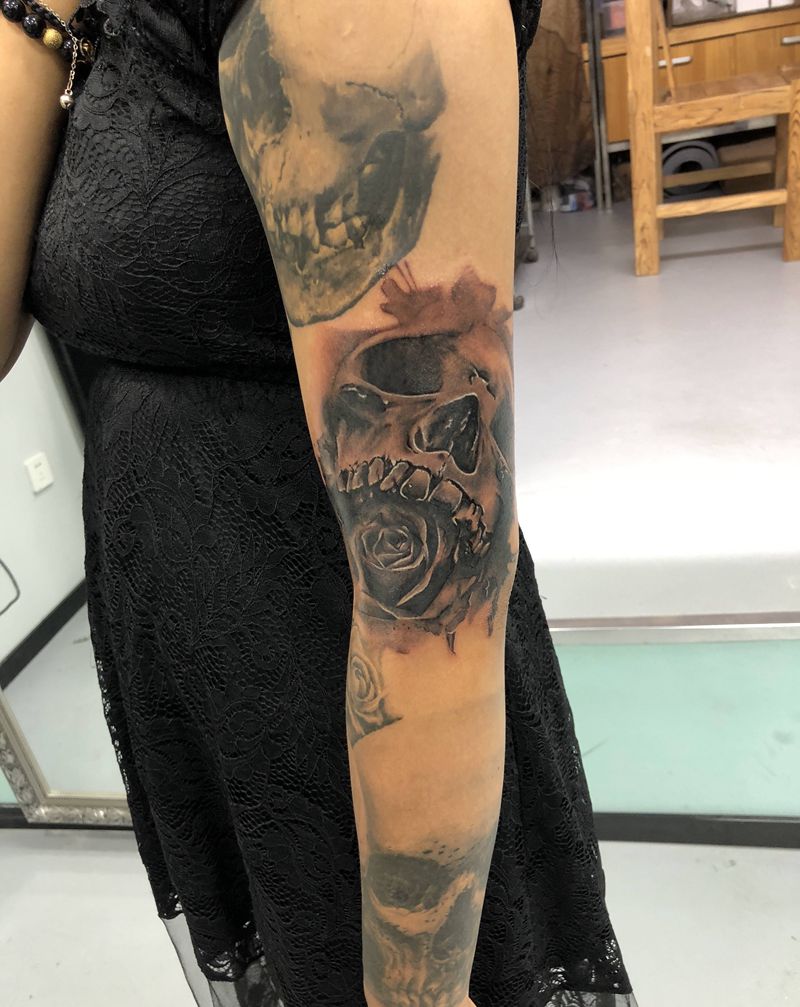 写实骷髅和玫瑰纹身图片_手臂欧美写实纹身图案