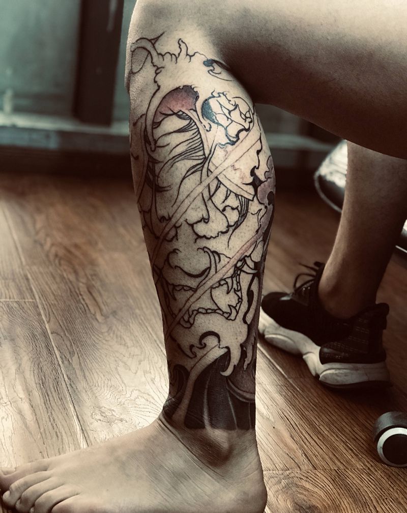• T网红王老大花腿龙纹身图片_腿部新传统纹身图案