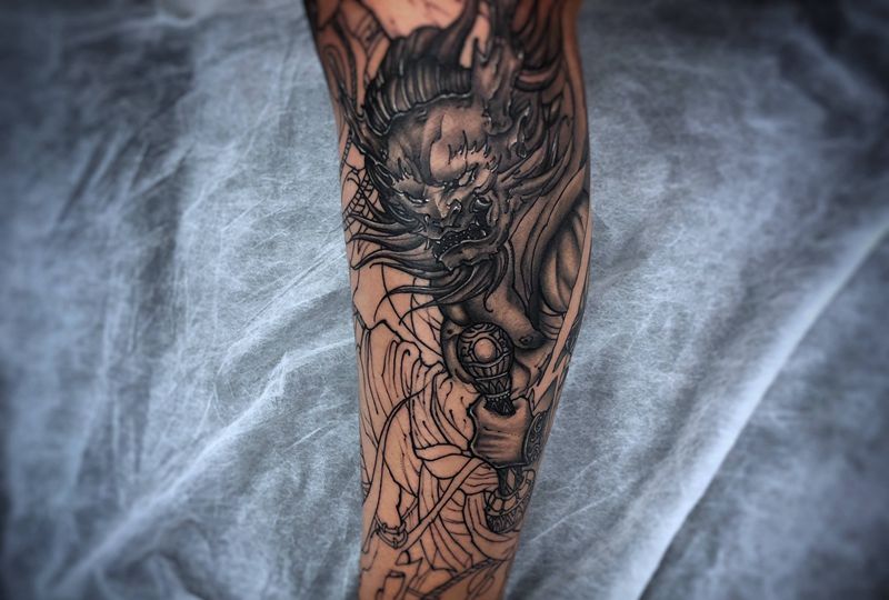 雷神纹身图片_腿部新传统纹身图案