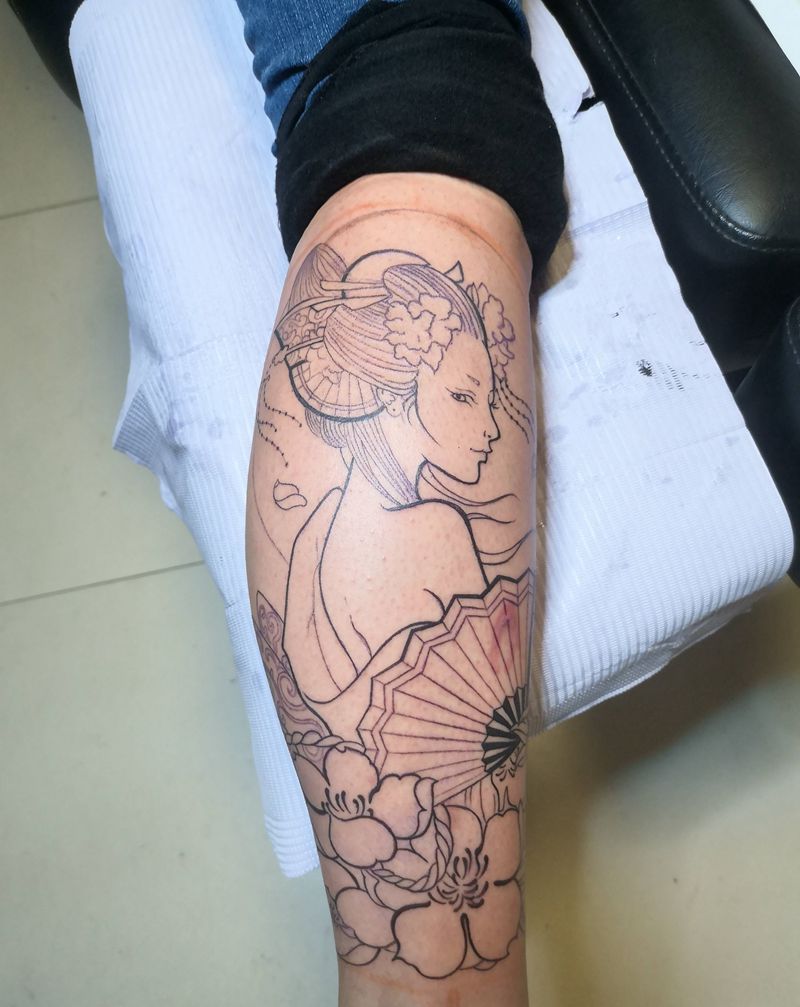 人物线条纹身图片_腿部纹身图案