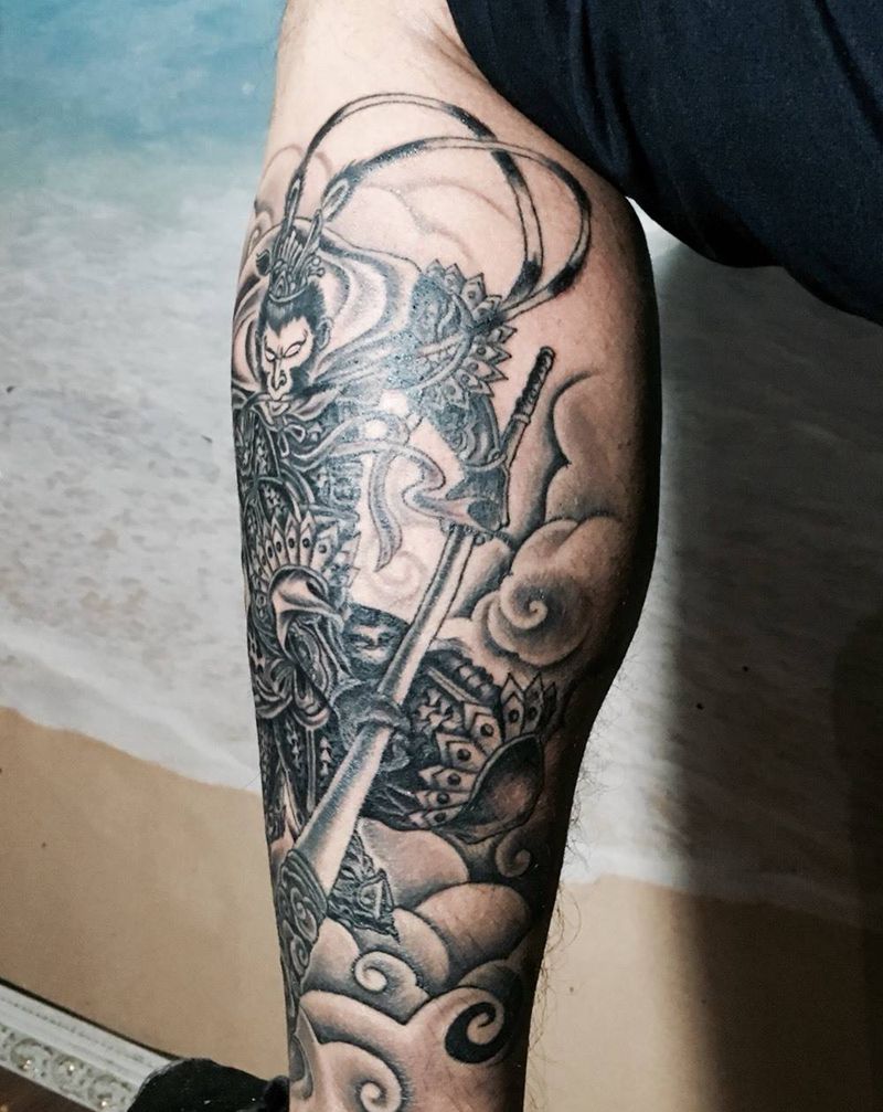 当前位置: 首页 >安徽省淮南市纹身店-名门刺青纹身图案>大圣纹身图片_成品腿部传统鬼神纹身图案