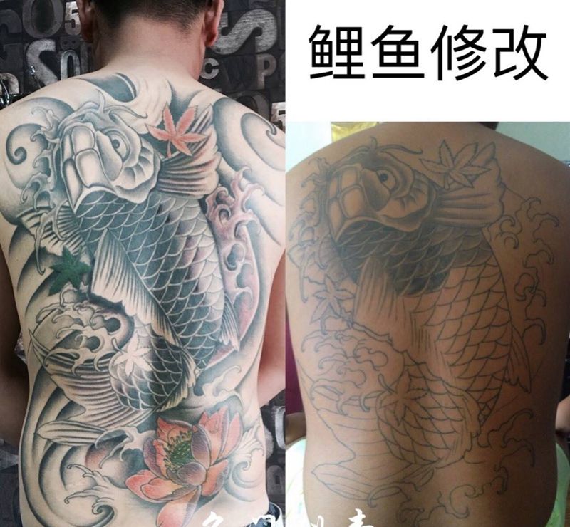 鱼纹身图片_成品背部传统动物修改纹身图案