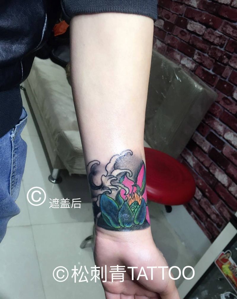 今日手腕图腾遮盖~设计荷花和浪花元素……纹身图片