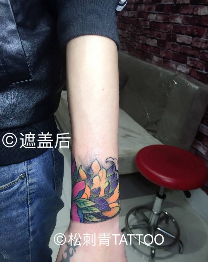 今日手腕图腾遮盖~设计荷花和浪花元素……纹身图片