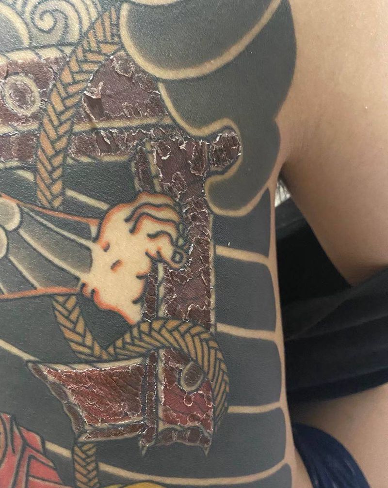 扎点彩色纹身图片_背部老传统纹身图案
