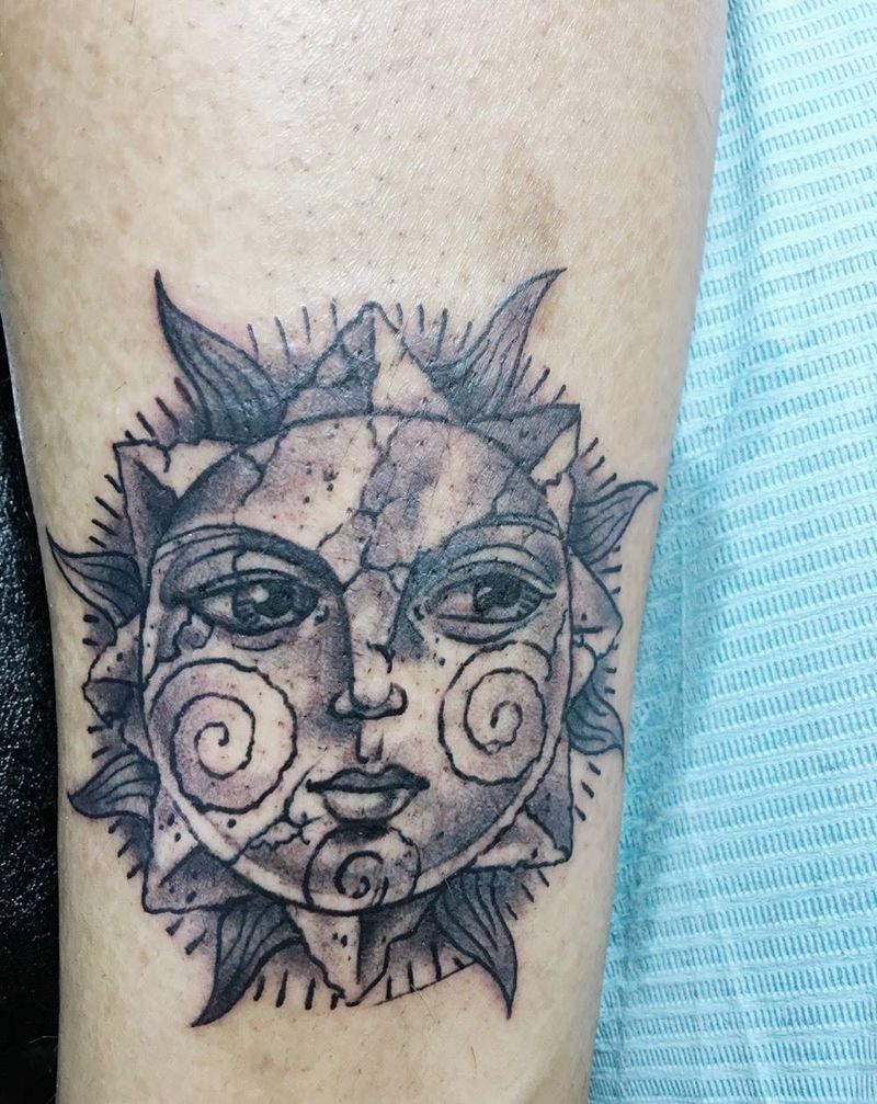 当前位置: 首页 >安徽省淮南市纹身店-壹捌刺青纹身图案>太阳神纹身图片_欧美宗教人物腿部成品纹身图案