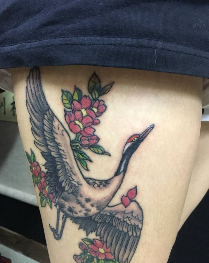 仙鹤纹身纹身图片_成品腿部传统动物植物纹身图案