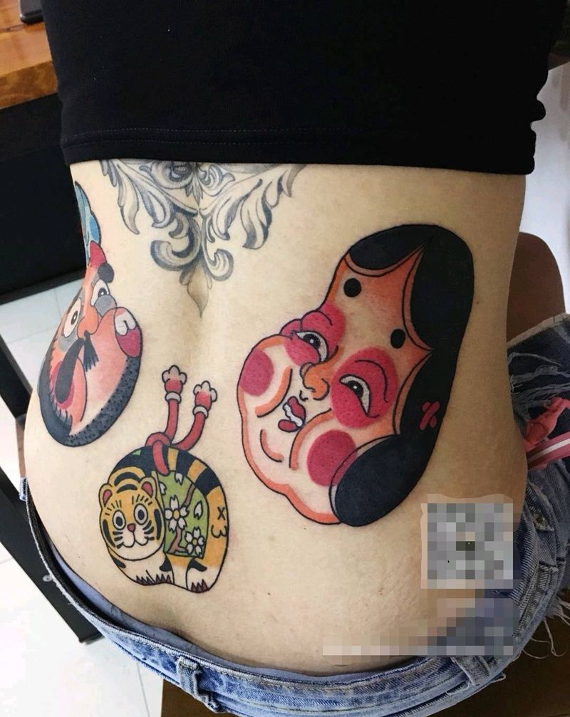 小老虎 火男和丑女纹身图片_腰部老传统纹身图案