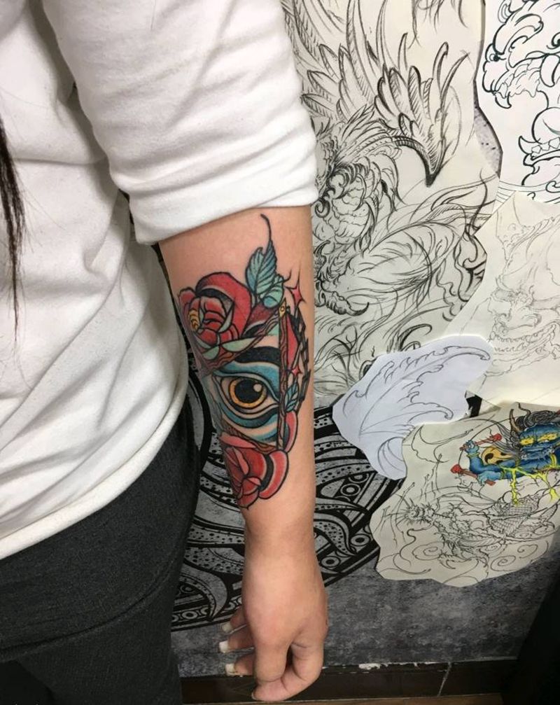 • 手背潮流时尚的玫瑰花眼睛纹身图案