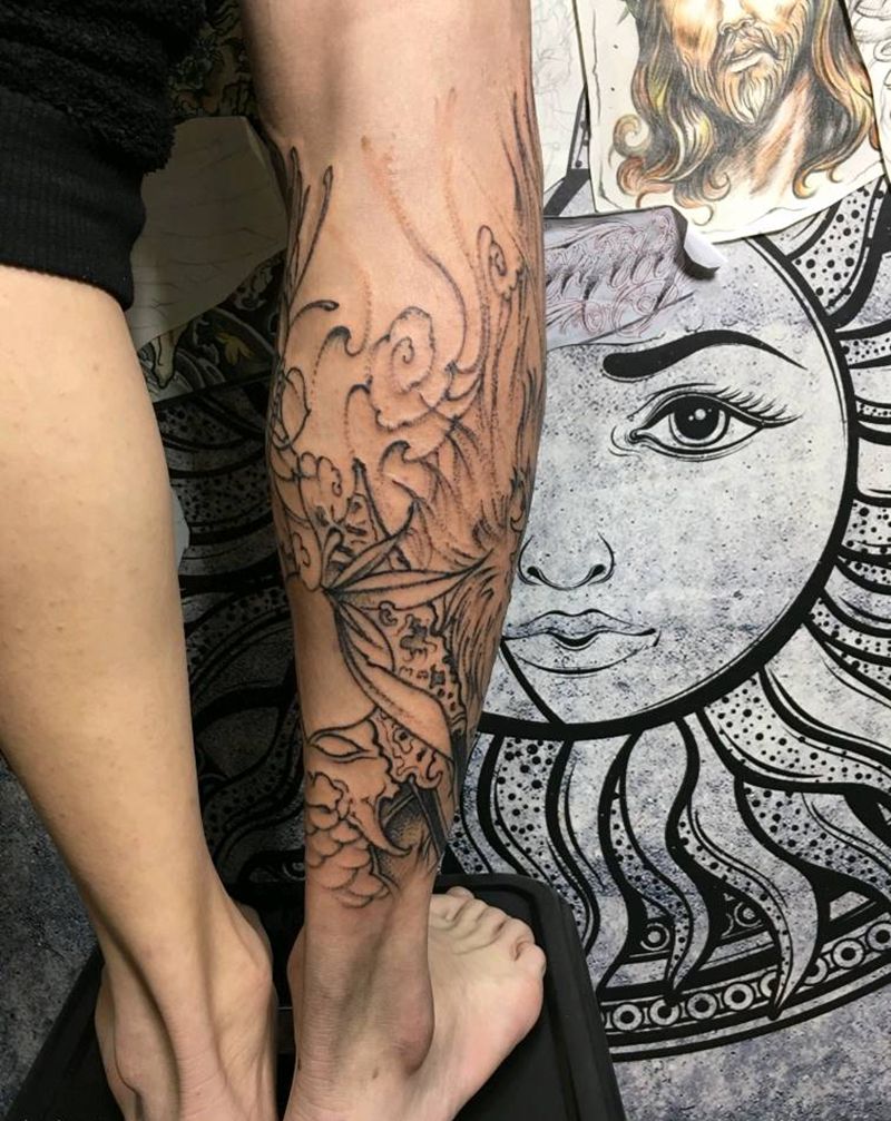 • T网红王老大花腿龙纹身图片_腿部新传统纹身图案
