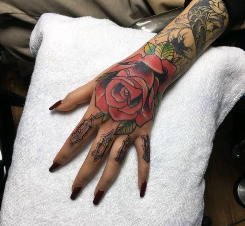 • 手背潮流时尚的玫瑰花眼睛纹身图案