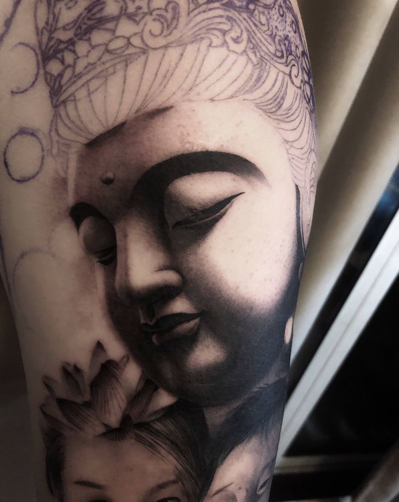 观音大士守护纹身图片_手臂欧美写实家人 守护纹身图案