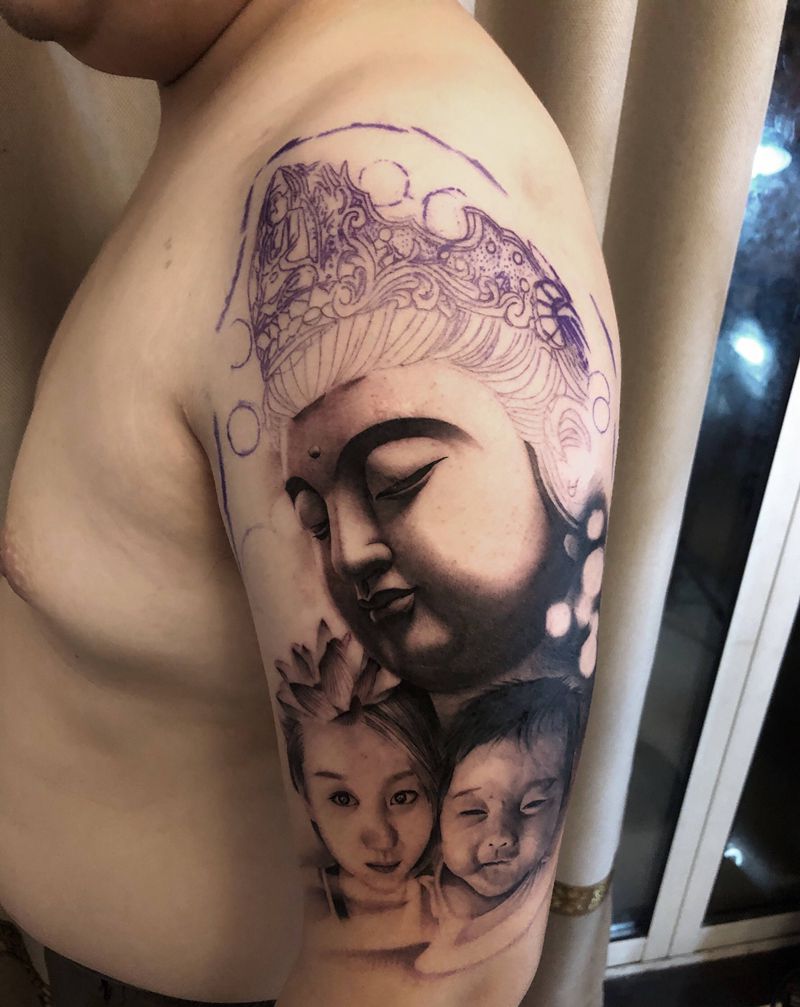 当前位置: 首页 >安徽省安庆市纹身店-辰针刺青处纹身图案>观音大士守护纹身图片_手臂欧美写实家人 守护纹身图案