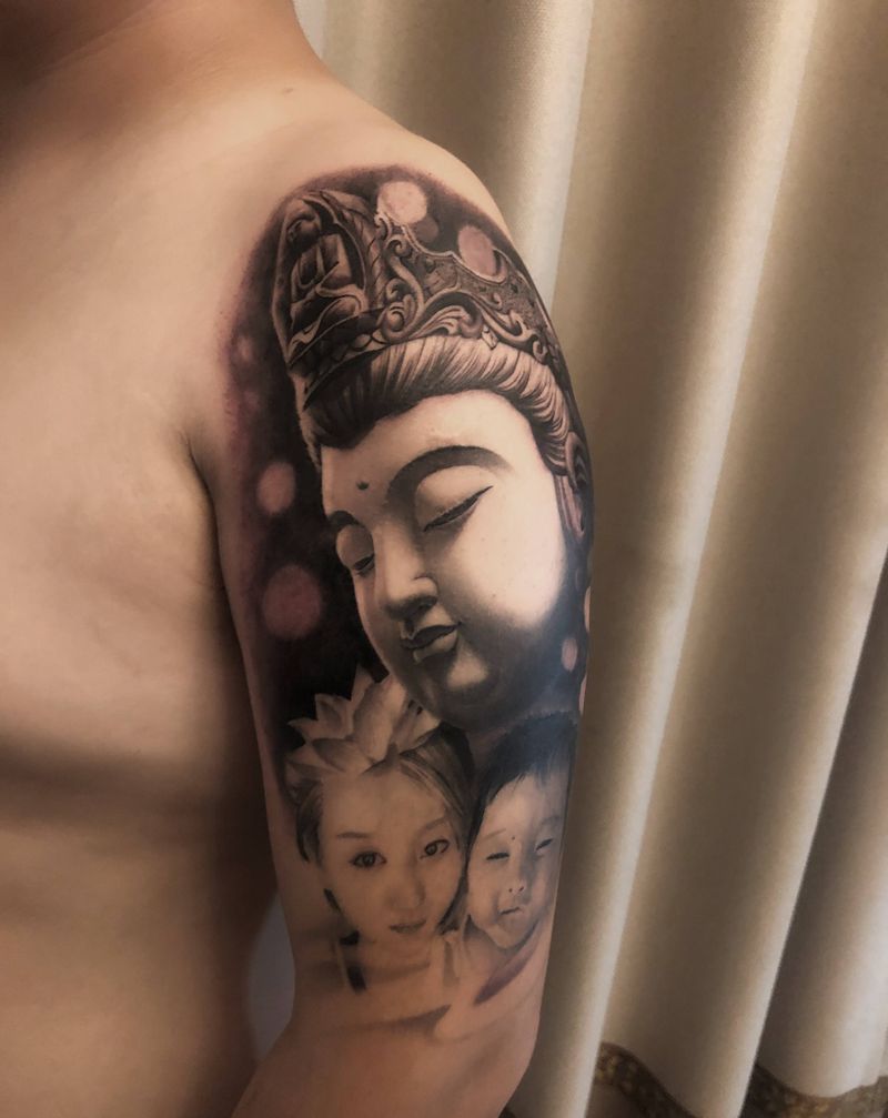 当前位置: 首页 >安徽省安庆市纹身店-辰针刺青处纹身图案>观音大士守护纹身图片_手臂欧美写实家人 守护纹身图案