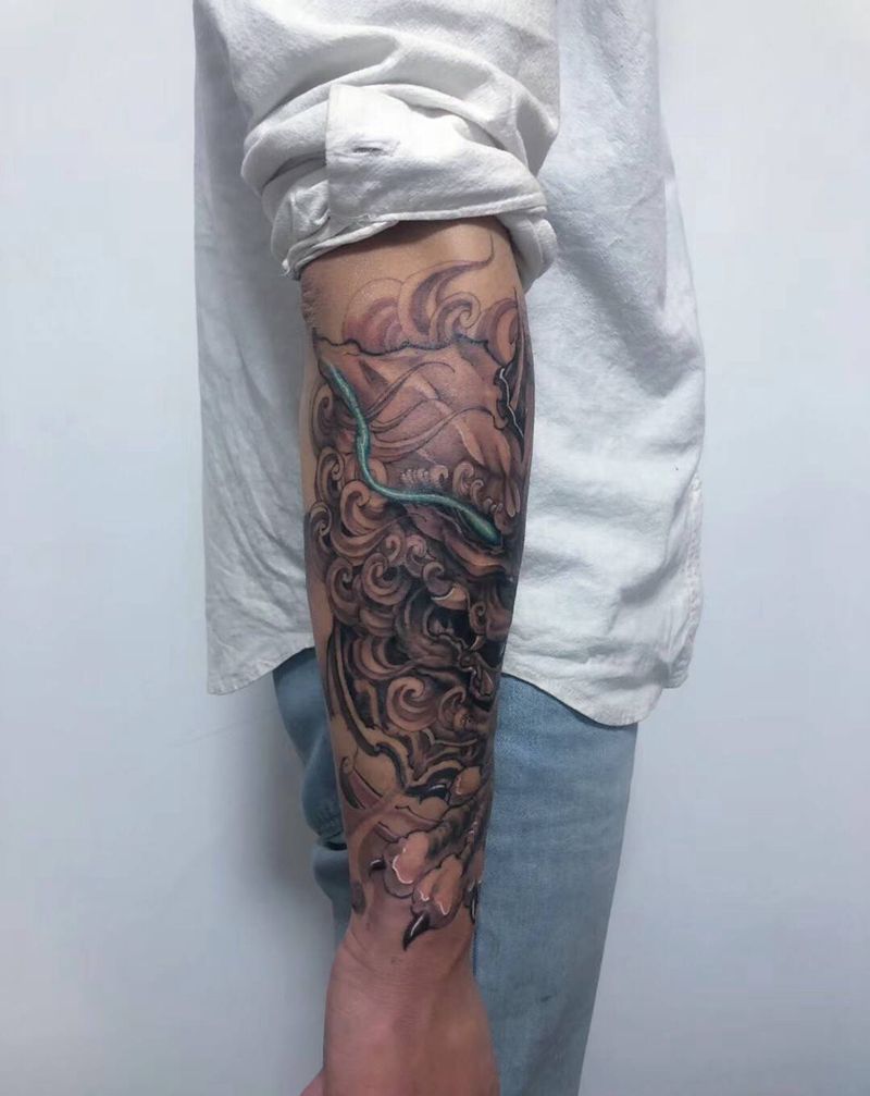 新传统唐狮纹身图片_手臂腿部新传统纹身图案