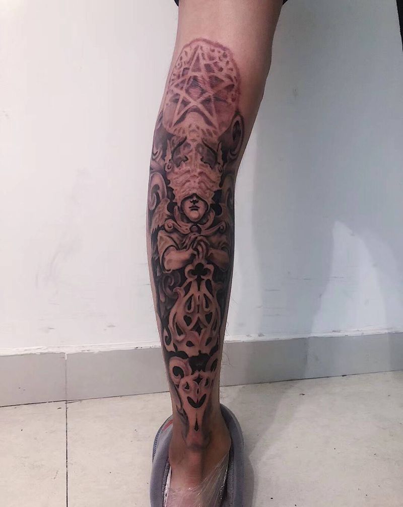 包小腿大天使纹身图片_腿部欧美写实纹身图案