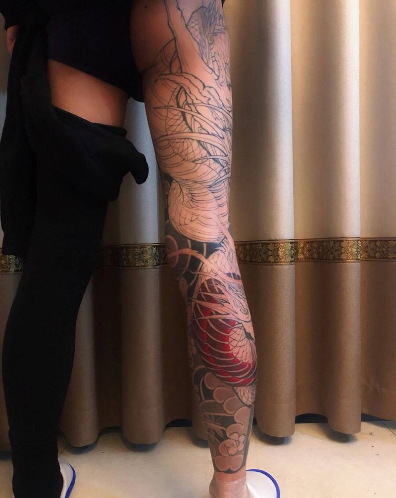 • T网红王老大花腿龙纹身图片_腿部新传统纹身图案