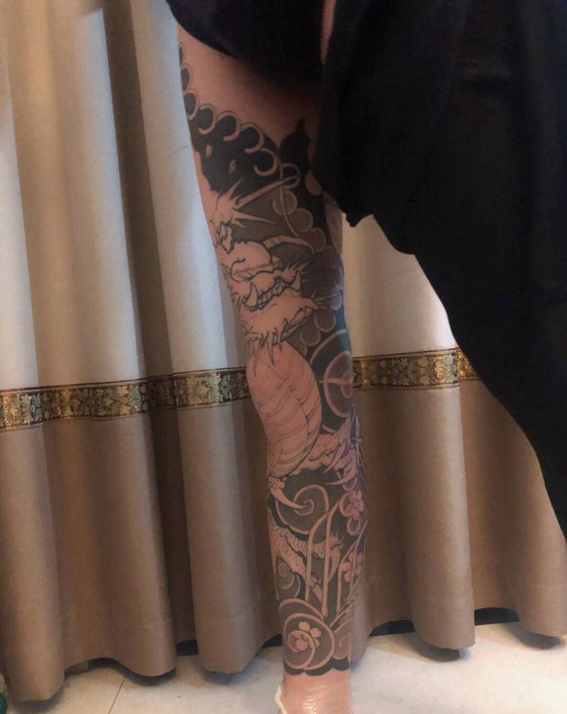 • T网红王老大花腿龙纹身图片_腿部新传统纹身图案