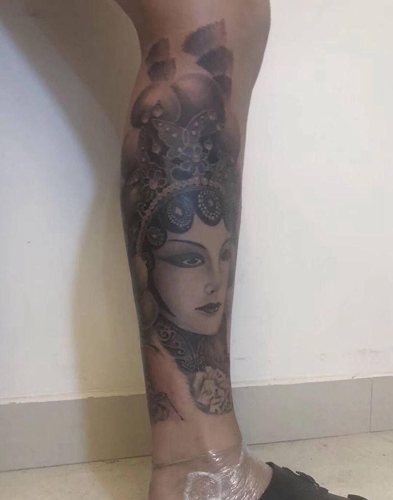 当前位置: 首页 >安徽省安庆市纹身店-辰针刺青处纹身图案>小腿刀马旦纹身图片_腿部欧美写实纹身图案