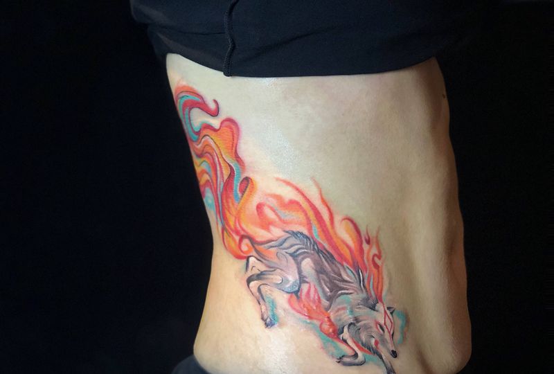 当前位置: 首页 >安徽省淮南市纹身店-雲.刺青纹身图案>九尾神狐纹身图片_腰部水彩纹身图案