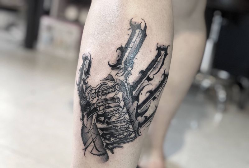 暗黑手掌纹身图片_腿部花体字纹身图案