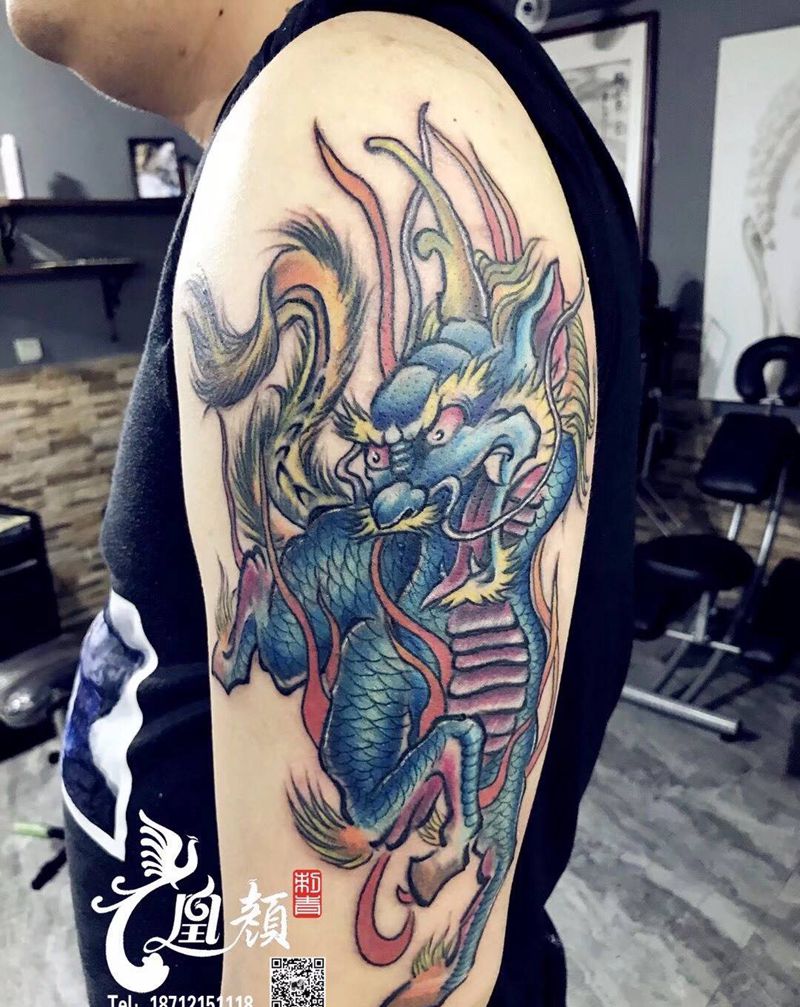 • T网红王老大花腿龙纹身图片_腿部新传统纹身图案