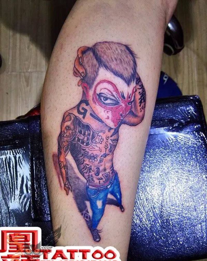 • T包小腿吹火男+阿多福纹身图片_腿部老传统新传统吹火男阿