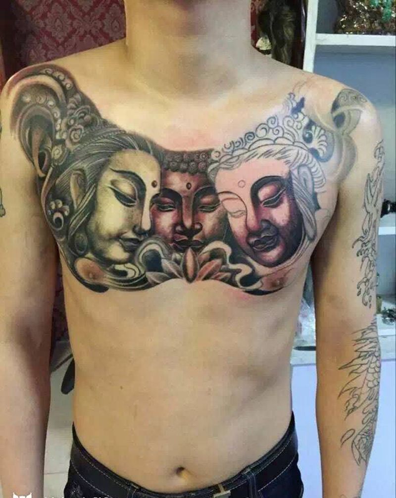 三面佛纹身图片_胸部传统成品宗教纹身图案