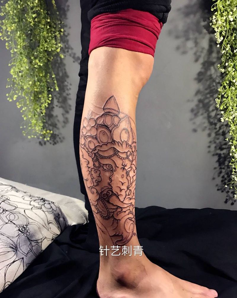 当前位置: 首页 >安徽省滁州市纹身店-针艺刺青工作室纹身图案>小腿象神线条纹身图片