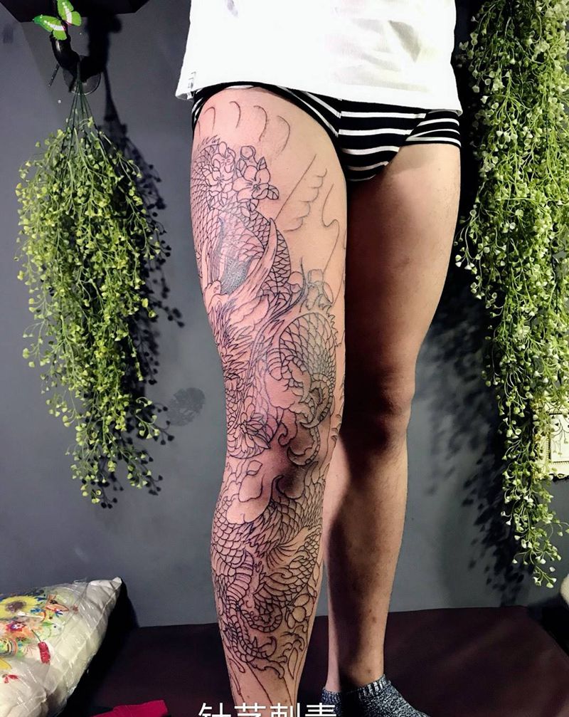 当前位置: 首页 >安徽省滁州市纹身店-针艺刺青工作室纹身图案>包腿龙线条纹身图片
