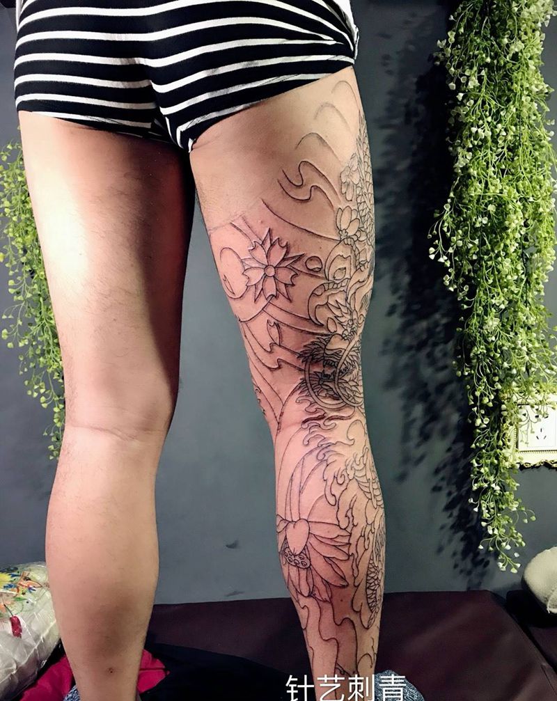当前位置: 首页 >安徽省滁州市纹身店-针艺刺青工作室纹身图案>包腿龙线条纹身图片
