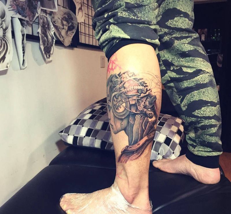 • T包小腿吹火男+阿多福纹身图片_腿部老传统新传统吹火男阿