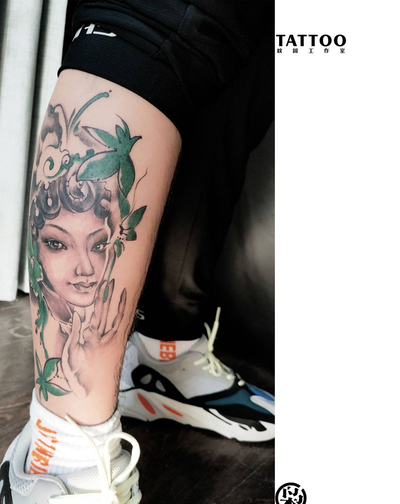 当前位置: 首页 >安徽省阜阳市纹身店-枭·纹图工作室纹身图案>花旦纹身图片_腿部水墨纹身图案