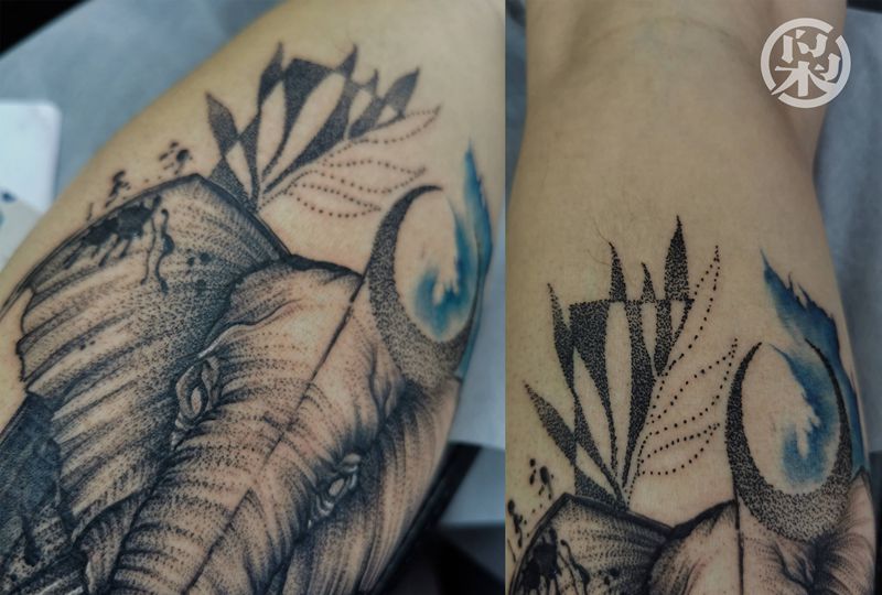 当前位置: 首页 >安徽省阜阳市纹身店-枭·纹图工作室纹身图案>象纹身图片_腿部点刺水墨纹身图案