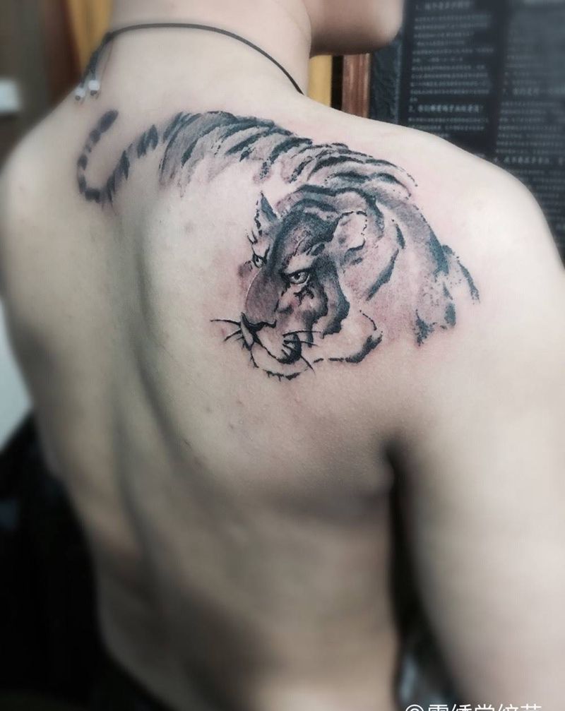 当前位置: 首页 >安徽省阜阳市纹身店-临泉雷绣堂艺术纹身工作室纹身图案>水墨虎纹身图片