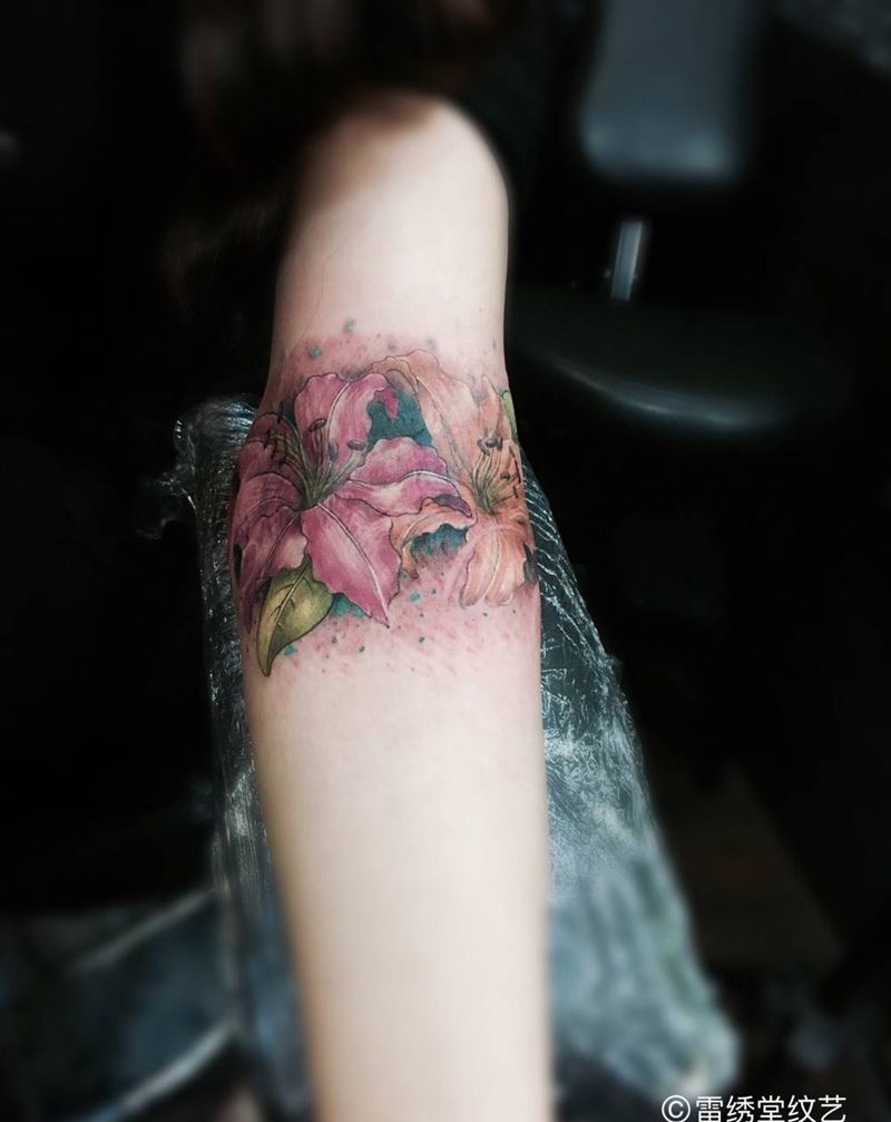 当前位置: 首页 >安徽省阜阳市纹身店-临泉雷绣堂艺术纹身工作室纹身图案>百合花遮盖烫伤疤痕纹身图片
