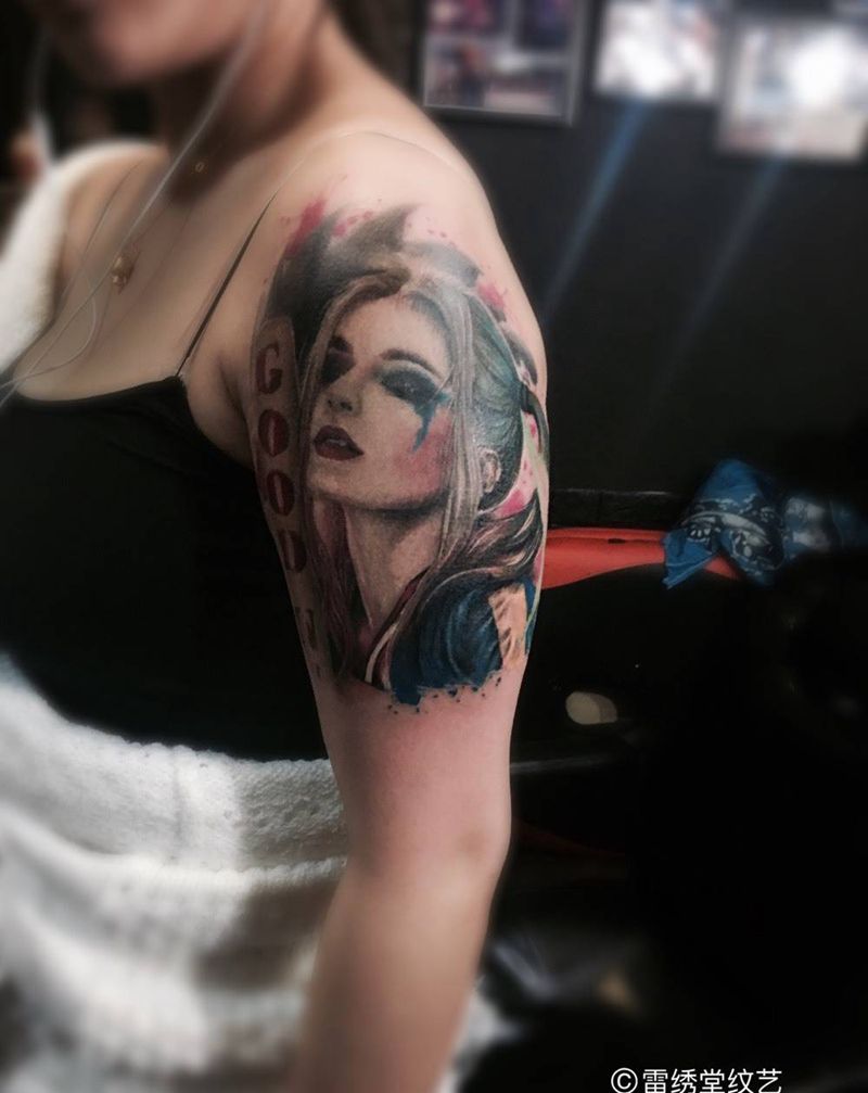 当前位置: 首页 >安徽省阜阳市纹身店-临泉雷绣堂艺术纹身工作室纹身图案>自杀小分队小丑女完工!纹身图片
