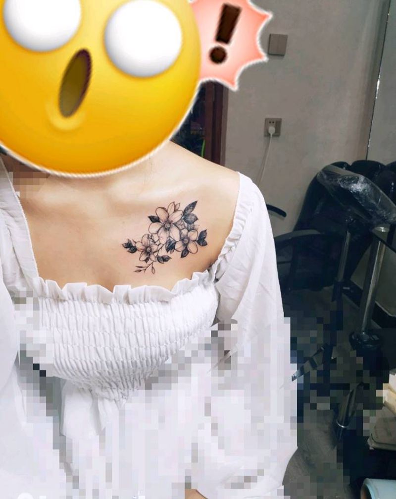 胸口素花纹身图片_胸部点刺素花锁骨胸口纹身图案