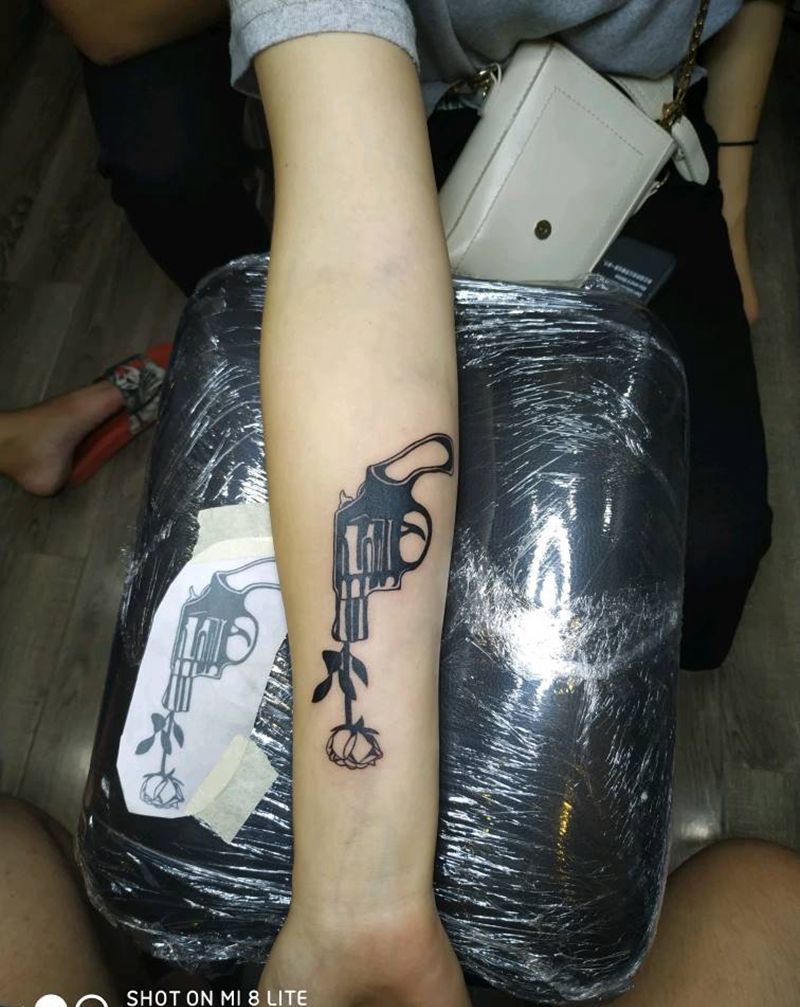 当前位置: 首页 >安徽省阜阳市纹身店-龍門刺青工作室纹身图案>枪花纹身图片_手臂Old School手枪玫瑰纹身图案