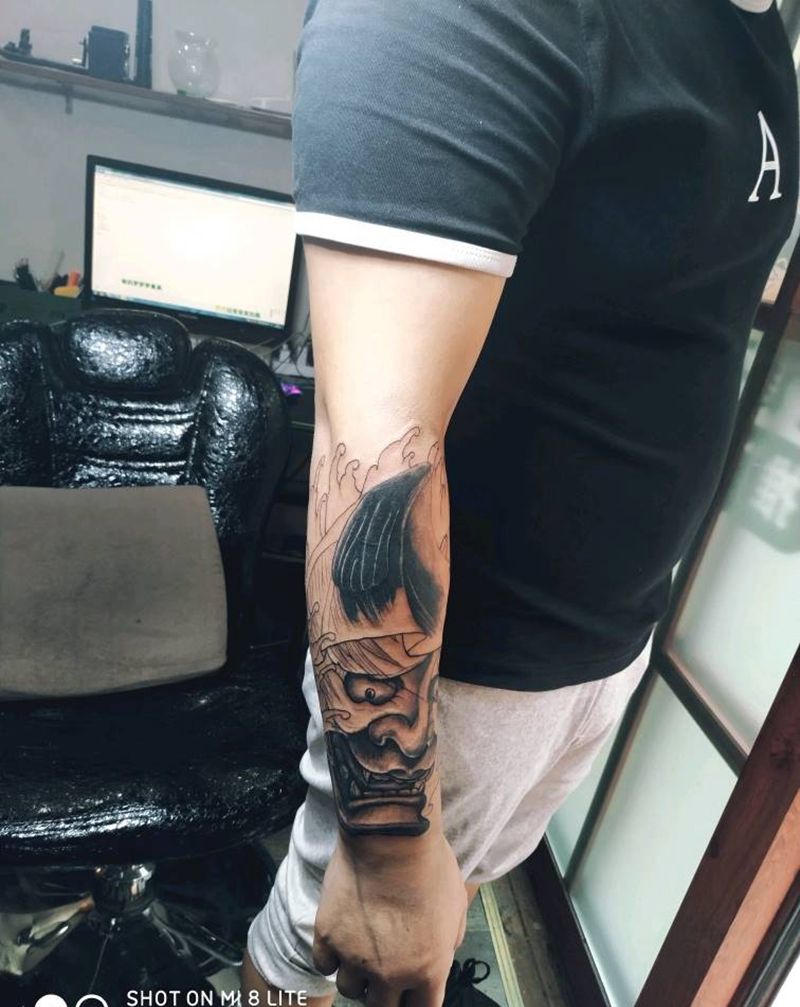 当前位置: 首页 >安徽省阜阳市纹身店-龍門刺青工作室纹身图案>般若遮盖蝎子未完成纹身图片_手臂新传统般若遮盖包小臂纹身图案
