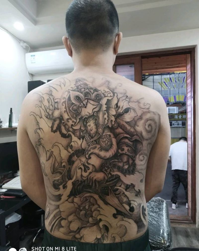 满背象神麻药效果纹身图片_背部新传统满背象神牡丹纹身图案