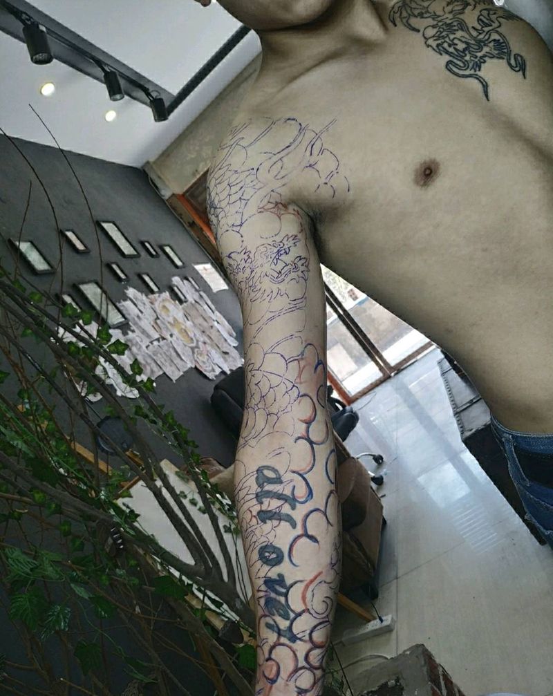 当前位置: 首页 >安徽省阜阳市纹身店-龍門刺青工作室纹身图案>花臂遮盖第一遍线纹身图片_手臂老传统纹身图案