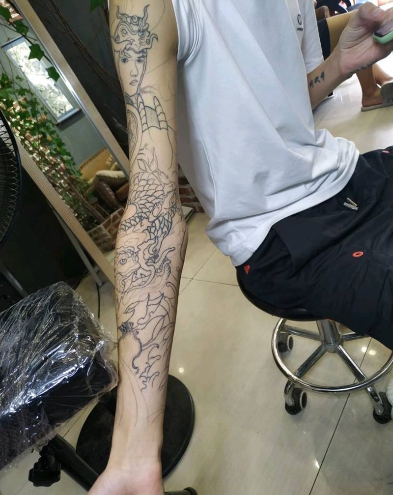 花臂修改纹身图片_手部新传统修改花臂龙纹身图案